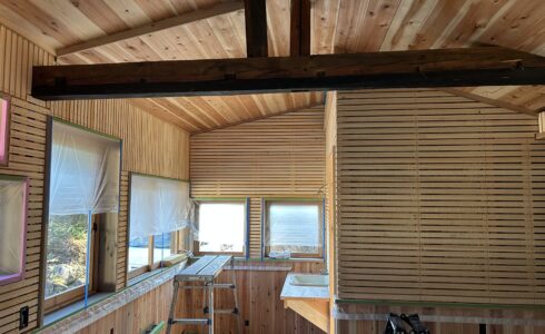 柱を立て、そこに3センチ厚の杉板を落とし込んでは壁を作っていく。